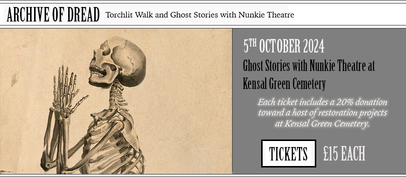 Were they fantasy or reality? The outpourings of a deranged mind or a faithful witness to otherworldly occurrences? Join us after sundown in Kensal Green Cemetery for a torchlit walk through the graveyard, before proceeding to the Dissenters’ Chapel, where by flickering candlelight Robert will share a selection of these chilling tales with you. Do you dare open … The Archive of Dread?