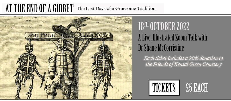 | AT THE END OF A GIBBET - The Last Days of a Gruesome Tradition A Live, Illustrated Zoom Talk with the historian Dr Shane McCorristine Tuesday 18th October 2022 at 7:00 pm On June 11 1832 William Jobling - a miner from Jarrow - was involved in the assault of a local magistrate, who later died. Jobling was convicted of murder and was sentenced to be executed at Durham, followed by “hanging in chains” on a gibbet in Jarrow. Gibbeting was a particularly gruesome punishment, introduced by the Murder Act of 1751, which stipulated that the body of a murderer should never be buried. Instead the corpse was either used for dissection, to help surgeons better understand human anatomy, or hung on a gibbet to decompose in public, as a deterrent to other potential criminals. After his execution William Jobling’s body was toured round the local area and then hung in chains on a gibbet post that had been installed in the muddy waters of Jarrow Slake - a tidal mud flat in Tyneside. Some days later the body and the gibbet irons disappeared in mysterious circumstances, presumably stolen by the dead man’s miner colleagues. Jobling has since become something of a folk hero in popular culture and was the subject of ballads, plays, artworks, and even special edition ales. Dr McCorristine’s talk will explore the particular postmortem punishment of gibbeting, the background of this case and the strange afterlife of William Jobling. Tickets £5 including a 20% donation toward a host of restoration projects at Kensal Green Cemetery. Please click here to purchase. Dr Shane McCorristine Shane McCorristine is a Lecturer in Modern British History at Newcastle University. An interdisciplinary historian, his research focuses on the 'night side' of modern experience. Drawing approaches from cultural history and the medical humanities, he explores social attitudes toward dreams, ghosts, death and the supernatural. He is the author of Spectres of the Self: Thinking about Ghosts and Ghost-seeing in England, 1750-1920 (Cambridge University Press, 2010), Spiritualism, Mesmerism, and the Occult, 1800-1920 (Pickering & Chatto, 2012), and most recently, The Spectral Arctic: A History of Dreams and Ghosts in Polar Exploration (UCL Press, 2018). PLEASE NOTE - This talk will take place virtually via Zoom. Ticket sales will end at 5:00 pm BST on the day of the lecture. A link to the conference will be sent to the email used at checkout at 3:00 pm BST on the day of the event. Please email suzette@acuriousinvitation.com in the event your link fails to arrive. Please note this talk will be recorded and can be sent free of charge to ticket holders by request. Image Credit - An Odd Sight Sometime Hence (c. 1756) by George Bickham the Younger. CC BY-NC-SA 4.0 Creative Commons courtesy of the British Museum | ![]() |