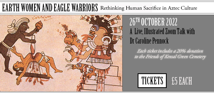 | EARTH WOMEN AND EAGLE WARRIORS Rethinking Human Sacrifice in Aztec Culture A Live, Illustrated Zoom Talk with historian Dr Caroline Pennock on Wednesday the 26th October 2022 at 7:00 pm This lecture will take place virtually, via Zoom. Attendees may request a video recording after the lecture takes place by emailing proof of purchase to info@acuriousinvitation.com The history of the Aztecs has been haunted by the spectre of human sacrifice. As bloody priests and brutal warriors, the Aztecs (or more correctly Mexica) people the pages of history, myth and fiction, their spectacular violence dominating popular understandings of their culture and casting a veil over their unique way of life.