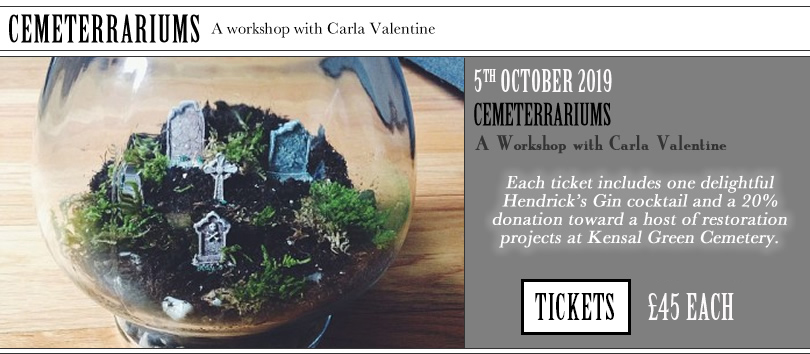 | CEMETERRARIUMS A Workshop with Carla Valentine Saturday 5th October 2019 from 3:00 till 6:00 pm No household should be without a “cemeterrarium” - a self-sustaining miniature representation of a graveyard. Pathologist and mortician Carla Valentine will guide you through building your own micro-necropolis housed in an elegant glass dome. Discover which plants are suitable for terrariums and find out how to craft tiny tombstones out of sculpey clay, to transform bare twigs into miniature trees and to populate your diminutive garden of rest with a host of macabre models. All materials will be provided at this workshop and you'll go home with your own pocket-sized cemetery.