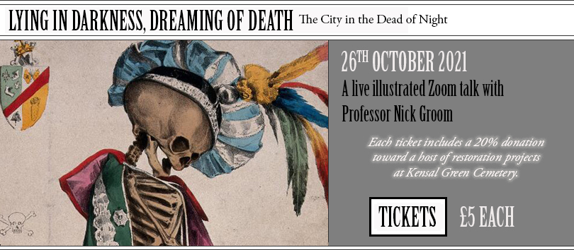| LYING IN DARKNESS, DREAMING OF DEATH - The City in the Dead of Night A Live, Illustrated Zoom Talk with Professor Nick Groom Tuesday 26th October 2021 at 7:00 pm What does night mean for the city? What lies behind the drawn curtains? This talk is an imaginary walk through the city at night, describing the nocturnal, often unseen, after-hours cultures. Nightwalking was once illegal, and it still carries a tense aura – like a trespass on a strange realm – but what can darkness reveal about the city? Nick Groom examines the custom of lying-in (keeping corpses at home before the funeral), the exhumation of human remains, whether legal or criminal, and other activities undertaken between the hours of dusk and dawn. We will nightwalk through the city and through time, in the company of artists and writers, anecdotes and urban folklore. Will we find ourselves, like moths, drawn to the bright city lights, or shall we drift into the deeper shadows of dereliction, towards the cemeteries, towards the dead? And how has the experience of the last 18 months, of pandemic and lockdown, affected the nightwalker – indeed, have the politics of the night, even of dreams, shifted...? The talk will be illustrated with many dark images. Tickets £5 including a 20% donation toward a host of restoration projects at Kensal Green Cemetery. Please click here to purchase. Prof. Nick Groom Nick is Professor of English Literature at the University of Macau, an author on subjects ranging from the history of the Union Jack to Thomas Chatterton. He has edited several books and regularly appears on television, radio, and at literary festivals as an authority on English Literature, seasonal customs, J. R. R. Tolkien, the ‘Gothic’ and ‘British’ and 'English' identities. Due to his extensive work on the Gothic, especially on the history of vampires, he has become known as the 'Prof of Goth' in the media. He has written several articles on the Goth scene, including essays on the singer-songwriter Nick Cave, as well as editing classics such as Mary Shelley’s Frankenstein. PLEASE NOTE - This talk will take place virtually via Zoom. Ticket sales will end at 5:00 pm BST on the day of the lecture. A link to the conference will be sent to the email used at checkout at 3:00 pm BST on the day of the event. Please email suzette@acuriousinvitation.com in the event your link fails to arrive. . | ![]() |