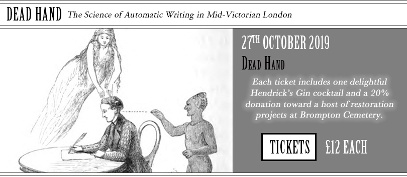 | DEAD HAND The Science of Automatic Writing in Mid-Victorian London with Robert Dickins At Brompton Cemetery Chapel on Sunday 27th October 2019 at 3:00 pm Why would someone choose to write or draw and then claim not to be the author of those words or images? During the 1850s, an increasing amount of people began to practice what was variously described as writing mediumship, automatic writing, or passive writing. Those writers claimed that the authority of their words belonged not to them, but to the dead. This talk will explore the notion that relinquishing authorship paradoxically imbued the practitioner with new forms of spiritual authority - forms that challenged orthodox hierarchies in the home, the church, and wider society. It was a time when the dead took a role in democratising the power of the living.