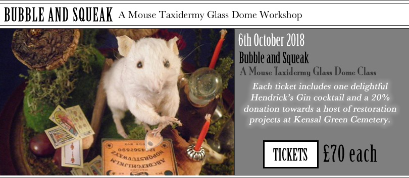 | BUBBLE AND SQUEAK Mouse taxidermy - a glass dome class in the cemetery Saturday 6th October 2018 from 11:00 am A five hour mouse taxidermy workshop in which participants will be given the opportunity to create an anthropomorphic, Potter-style mouse in a glass dome. Props, costumes and a glass dome will be provided for each mouse and participants will be able to take creations home. This workshop will introduce students to the process and techniques behind basic taxidermy, teaching them how to skin, prep, preserve, mount and position the animal. Students can choose to pose their mount in a naturalist setting, but they will also be introduced to the art of anthropomorphism, the attribution of human characteristics to animals. This practice has been widely explored in the medium of taxidermy and was most famously realised by the Victorian taxidermist Walter Potter. His Museum of Curiosities featured wondrous bestial dioramas including a classroom of 48 bunnies in 'Rabbit School' and a wedding party of kittens dressed in morning coats and lace dresses with frilly knickers. This is a beginners' course with no experience required and you will leave with your own stuffed mouse in a glass dome with which to adorn your mantelpiece at home. Travel advice to the Dissenters' Chapel - During the day guests can walk through the cemetery to get to the chapel but at night the main cemetery gates on the Harrow Road will be closed and the only accessible entrance is on Ladbroke Grove. Previously the address for this entrance was 364 Ladbroke Grove but this number has now been updated to 391.