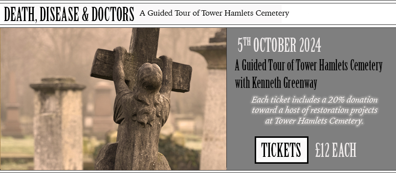 Following a general introduction to Tower Hamlets Cemetery Park, Kenneth Greenway will take you on a tour of the graveyard, focusing on those buried here who were doctors or died of disease. This will include the grave of the doctor who performed the autopsy on Jack the Ripper’s first victim and the monument to the children from Dr Barnardo’s homes, which took care of abandoned or poverty-stricken children. You will also see the graves of the numerous victims of the cholera, smallpox and tuberculosis epidemics that ravaged Victorian society.