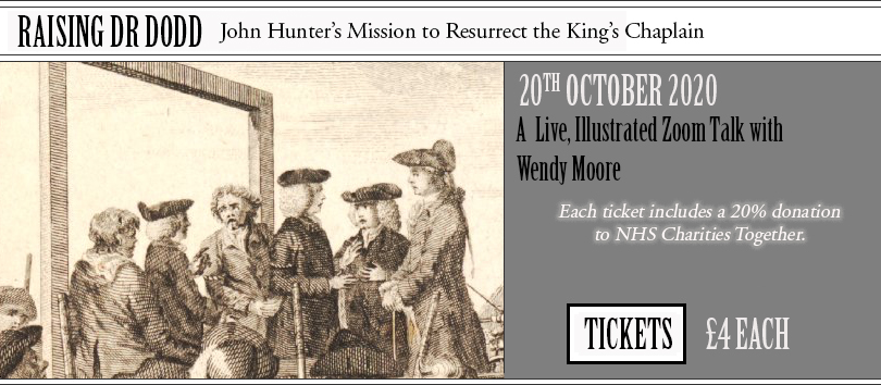 | RAISING DR DODD - John Hunter's Mission to Resurrect the King's Chaplain A Live, Illustrated Zoom Talk with historian Wendy Moore Tuesday 20th October 2020 at 7:00 pm In May 1777 the Reverend Dr William Dodd was sentenced to hang. As honorary chaplain to George III, Dodd had become the most fashionable clergyman of the age before his fall from grace over a silly attempt at forgery. A huge public campaign to save his neck, backed by the writer Samuel Johnson, was in vain and Dodd was taken to the gallows at Tyburn on 27 June. Yet even as he felt the noose around his neck, Dodd had not lost hope of being saved. For if Samuel Johnson’s words had failed him, Dodd fully believed that the talents of his friend John Hunter, the infamous surgeon and founder of the Hunterian Museum, would bring him back from the dead. In this fascinating talk, Wendy Moore, the best-selling author of The Knife Man, Wedlock and Endell Street, reveals the posthumous adventure of the corpse of Rev Dr Dodd. Tickets £4 early bird available for a limited time only including a 20% donation to NHS Charities Together. Please click here to purchase. Wendy Moore Wendy Moore is a freelance journalist and author of five non-fiction books on medical and social history. Her first book, The Knife Man, tells the story of the maverick medical pioneer John Hunter. Her latest book, Endell Street, was a BBC Radio 4 Book of the Week. You can see more of her work at www.wendymoore.org. PLEASE NOTE - This talk will take place virtually via Zoom. Ticket sales will end at 5:00 pm BST on the day of the lecture. A link to the conference will be sent to the email used at checkout at 6:00 pm BST on the day of the event. Please email suzette@acuriousinvitation.com in the event your link fails to arrive. Please note this talk will be recorded and can be sent free of charge to ticket holders by request. | ![]() |