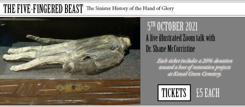| THE FIVE-FINGERED BEAST - The Sinister History of the Hand of Glory A Live, Illustrated Zoom Talk with Historian Dr. Shane McCorristine Tuesday 5th October 2021 at 7:00 pm From ‘Thing’ in the Addams Family to Dr. Strangelove’s ‘alien hand’, contemporary audiences are familiar with images of sinister, dismembered hands. But this grisly gothic motif can be traced back to a medieval legend: the ‘hand of glory’ was a pervasive and rooted northern European folk belief that the severed hand of a hanged man (in its most common articulation) could give its owner magical powers when it was turned into a candle. These powers varied according to region and time period, but were, among others, said to make housebreakers invisible and the house’s inhabitants unable to wake up. In this talk Shane McCorristine will set out the origins of this ancient superstition, before turning to the particular reasons why the hands of executed criminals were thought to have magical or virtuous powers by hangmen, apothecaries, healers, witches, and thieves in the early modern period. Dr McCorristine will examine the extent to which hands of glory were actually used and look at how the severed and animate magical hand became an important theme in nineteenth-century literature. Tickets £5 including a 20% donation toward a host of restoration projects at Kensal Green Cemetery. Please click here to purchase. Dr Shane McCorristine Shane McCorristine is a Lecturer in Modern British History at Newcastle University. An interdisciplinary historian, his research focuses on the 'night side' of modern experience. Drawing approaches from cultural history and the medical humanities, he explores social attitudes toward dreams, ghosts, death and the supernatural. He is the author of Spectres of the Self: Thinking about Ghosts and Ghost-seeing in England, 1750-1920 (Cambridge University Press, 2010), Spiritualism, Mesmerism, and the Occult, 1800-1920 (Pickering & Chatto, 2012), and most recently, The Spectral Arctic: A History of Dreams and Ghosts in Polar Exploration (UCL Press, 2018). PLEASE NOTE - This talk will take place virtually via Zoom. Ticket sales will end at 5:00 pm BST on the day of the lecture. A link to the conference will be sent to the email used at checkout at 3:00 pm BST on the day of the event. Please email suzette@acuriousinvitation.com in the event your link fails to arrive. . | ![]() |
