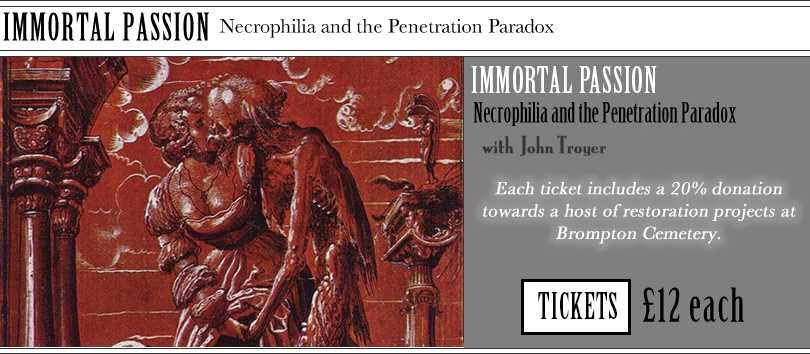 | IMMORTAL PASSION- Necrophilia and the Penetration Paradox with Dr John Troyer - Saturday 19th October 2019 from 1:00 pm In this talk, Dr John Troyer will uncover the history of necrophilia in the United States. In September 2006, Wisconsin police discovered Nicholas Grunke, Alexander Grunke and Dustin Radtke digging into the grave of a recently deceased woman. Upon questioning by police, Alexander Grunke explained that the three men wanted to exhume the body for sexual intercourse. In the Wisconsin state court system, the three men were charged with attempted third-degree sexual assault and attempted theft. None of the men could be charged with attempted necrophilia, however, since the state of Wisconsin had no law making necrophilia illegal. Necrophilia is not specifically prohibited on the statute books of many other US states. Dr John Troyer will argue that the ambiguous juridical standing of the human corpse compounds the sexual monstrousness of the necrophiliac and of necrophilic acts. Tickets £12 including a delightful gin cocktail. Please click here to buy. Dr John Troyer is the Deputy Director of the Centre for Death and Society at the University of Bath. His interdisciplinary research focuses on contemporary memorialization practices, concepts of spatial historiography, and the dead body’s relationship with technology. Dr. Troyer is also a theatre director and installation artist with extensive experience in site-specific performance across the United States and Europe. He is a co-founder of the Death Reference Desk website, the Future Cemetery Project and a frequent commentator for the BBC.