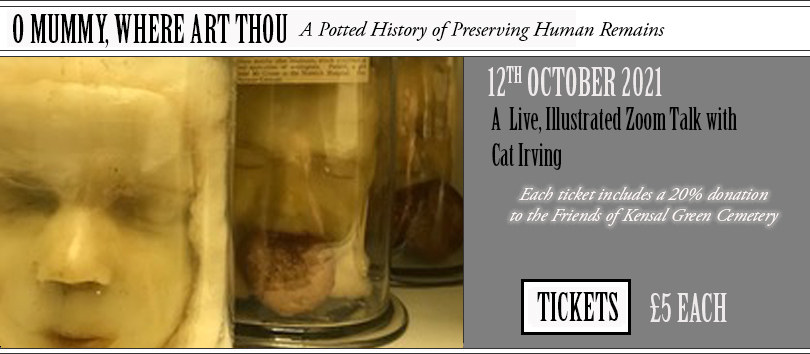 | O MUMMY, WHERE ART THOU? - A Potted History of Preserving Human Remains A Live, Illustrated Zoom Talk with Human Remains Conservator Cat Irving Tuesday 12th October 2021 at 7:00 pm The decay of our flesh after death is one of the inevitabilities of life, but throughout history people have tried to avoid this fate. From the mummification practices used to prepare the bodies of Egyptian Pharaohs for the afterlife, via taxidermy (six humans are know to have been stuffed), the embalming process used to preserve for posterity the bodies of revered political figures such as Abraham Lincoln and Vladimir Ilych Lenin, to the plastination technique developed by Gunther von Hagens which formed the basis of his touring Body Worlds show; from religious relics to specimens in jars, Cat Irving will give an overview of the history of the ways people have tried to fend off decomposition and preserve the human body. As Human Remains Conservator at Surgeons’ Hall Museums, Cat Irving will approach this subject with an insight to the work that she does with dead bodies every day, and examine the view that this can give us of our history, and our humanity. Tickets £5 including a 20% donation toward a host of restoration projects at Kensal Green Cemetery. Please click here to purchase. Cat Irving Cat Irving has been the Human Remains Conservator for Surgeons’ Hall since 2015 and has been caring for anatomical and pathological museum collections for nearly twenty years. After a degree in Anatomical Science she began removing brains and sewing up bodies at the Edinburgh City Mortuary. Following training in the care of wet tissue collections at the Royal College of Surgeons of England she worked with the preparations of William Hunter at the Hunterian Museum at Glasgow University. Cat is a licensed anatomist, and gives regular talks on anatomy and medical history. PLEASE NOTE - This talk will take place virtually via Zoom. Ticket sales will end at 5:00 pm BST on the day of the lecture. A link to the conference will be sent to the email used at checkout at 3:00 pm BST on the day of the event. Please email suzette@acuriousinvitation.com in the event your link fails to arrive. Please note this talk will be recorded and can be sent free of charge to ticket holders by request. Image Credit - Specimens at Surgeons' Hall courtesy of Cat Irving. | ![]() |