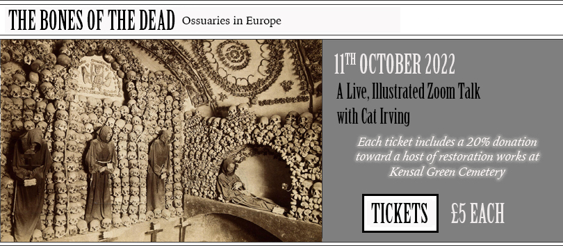 | THE BONES OF THE DEAD - Ossuaries in Europe A Live, Illustrated Zoom Talk with the Human Remains Conservator for Surgeons’ Hall, Cat Irving Tuesday 11th October 2022 at 7:00 pm The ossuary is a standard feature in any culture needing to do a Marie Kondo on the skeletal remains of its dead. Graveyards are the traditional resting place for the bodies of the recently deceased, who still have grieving relatives to remember them and to tend to their graves. But our bones are the most enduring parts of our mortal remains. What happens to them once those relatives have gone to the cemetery themselves and burial space is starting to run short? Whatever is society to do with all those surplus tibias and fibulas? Ossuaries - or bone banks - are known to have existed as far back as ancient Persia over 3000 years ago and have been unearthed in many civilisations. But how should we view them today: as practical storage solutions, objects of curiosity or an important way for us to interact with the dead and contemplate our own mortality? In this talk, Cat Irving will take you on a journey across Europe that will encompass painted skulls and bejewelled skeletons, bone chandeliers and the six million people who lie beneath the streets of Paris. Tickets £5 including a 20% donation toward a host of restoration projects at Kensal Green Cemetery. Please click here to purchase. Cat Irving Cat Irving has been the Human Remains Conservator for Surgeons’ Hall since 2015 and has been caring for anatomical and pathological museum collections for nearly twenty years. After a degree in Anatomical Science she began removing brains and sewing up bodies at the Edinburgh City Mortuary. Following training in the care of wet tissue collections at the Royal College of Surgeons of England she worked with the preparations of William Hunter at the Hunterian Museum at Glasgow University. Her latest accomplishments include cleaning the skeletal remains of the notorious 19th century serial killer William Burke. PLEASE NOTE - This talk will take place virtually via Zoom. Ticket sales will end at 5:00 pm BST on the day of the lecture. A link to the conference will be sent to the email used at checkout at 3:00 pm BST on the day of the event. Please email suzette@acuriousinvitation.com in the event your link fails to arrive. Please note this talk will be recorded and can be sent free of charge to ticket holders by request. Image Credit - Santa Maria della Concezione, Rome: skulls and skeletons of the friars arranged in arches and columns around the walls of the Convento dei Cappuccini. Public Domain courtesy of the Wellcome Collection. | ![]() |