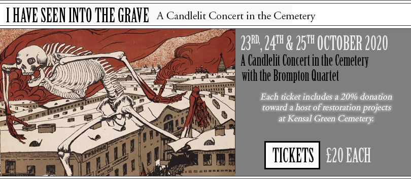 | “I HAVE SEEN INTO THE GRAVE” – String Quartets by Beethoven and Shostakovich Candlelit concerts in Kensal Green Cemetery with the Brompton Quartet There will be performances on Friday, Saturday & Sunday the 23rd, 24th and 25th October 2020 at 7:00 pm Enter the cemetery at sundown and proceed at your peril to this candlelit concert amidst the headstones of Kensal Green. Ludwig van Beethoven (1770-1827), String Quartet No 11 in F minor, opus 95. Written in 1810 for an intimate circle of friends and using experimental techniques Beethoven thought this piece too challenging to ever be performed in public. He gave it the title “serioso” - the only of his quartets he nicknamed - a bold assertion for someone who was not exactly an unserious composer. The music is tightly coiled, compressed, as if trapped, pervaded with a sense of oppression, perhaps reflecting the fact that Beethoven’s home city Vienna had recently been occupied by Napoleon. Stark, stormy and full of extreme contrasts, Opus 95 acts as a gateway to Beethoven’s final great bleak quartets. ***** Dmitri Shostakovich (1906-75), String Quartet No 8 in C minor, opus 110. Shostakovich was arguably the most morbid composer who ever lived. To be fair he had some justifications: he lived though Stalin’s terrors, the siege of Leningrad in World War Two, was declared an Enemy of the People by the Soviet regime and suffered from life-long ill health. Even after his bête noire Stalin died in 1953 misery continued to dog Shostakovich’s life. His wife Nina died soon after Stalin. When he wrote this “autobiographical” quartet over three days in July 1960 in Dresden he had just got divorced from his second wife, had been forced to join the Communist Party and begun to suffer from poliomyelitis. Little wonder then that the five movements of the piece reflect various shades of black. Friends said he had intended to commit suicide on his return to Russia Tickets £20 including a 20% donation to Kensal Green Cemetery. Please click here to purchase. PLEASE NOTE - In order to comply with social distancing regulations, these candlelit concerts can only have a very limited audience. |