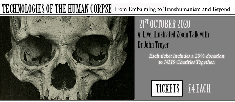 | TECHNOLOGIES OF THE HUMAN CORPSE - From Embalming to Transhumanism and Beyond A Live, Illustrated Zoom Talk with Dr John Troyer Wednesday 21st October 2020 at 7:00 pm Death and the dead body have never been more alive in the public imagination: not least because of current debates over modern medical technology that is seemingly deployed expressly to keep human bodies from dying, blurring the boundary between life and death. In his talk, Dr Troyer will explore the relationship of the dead body with technology through history, from nineteenth-century embalming machines to the death-prevention technologies of today. Dr Troyer will describe the "Happy Death Movement" of the 1970s; the politics of HIV/AIDS corpses and the productive potential of the dead body; the provocations of the Body Worlds exhibits and their use of preserved dead bodies; the black market in human body parts; and the transformation of historic technologies of the human corpse into "death prevention technologies.” Dr Troyer will ask you to think about death, dying, and dead bodies in radically different ways and will argue that the consequences of total control over death and the dead body are not liberation, but the abandonment of Homo sapiens as a concept and a species. Early bird tickets are just £4 and available for a limited time only. Tickets include a 20% donation to NHS Charities Together. Please click here to purchase. Dr John Troyer Dr John Troyer is the Director of the Centre for Death and Society at the University of Bath (www.bath.ac.uk). He is a co-founder of the Death Reference Desk website, the Future Cemetery Project and a frequent commentator for the BBC. His forthcoming book, Technologies of the Human Corpse, will be published by the MIT Press in 2020. He grew up in the American Funeral industry. PLEASE NOTE - This talk will take place virtually via Zoom. Ticket sales will end at 5:00 pm BST on the day of the lecture. A link to the conference will be sent to the email used at checkout at 6:00 pm BST on the day of the event. Please email suzette@acuriousinvitation.com in the event your link fails to arrive. Please note this talk will be recorded and can be sent free of charge to ticket holders by request. | ![]() |