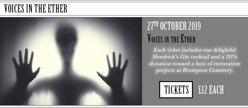 | VOICES IN THE ETHER Communing with the Dead with Rhodri Hayward At Brompton Cemetery Chapel on Sunday 27th October 2019 at 1:00 pm The rise of spiritualism moved hand in hand with advances in telecommunications. The first “mediums” in mid nineteenth-century Europe and North America presented their successes as a pioneer act of spiritual telegraphy, opening up a channel of communication between the realms of the dead and the Victorian home. By the twentieth century, technological advances such as wireless radio, television and home computing provided new materials for imagining the afterlife and our interactions with it. The dead were understood as lost radio transmissions trapped in the ionosphere or quite literal 'home recordings' in which past lives were traced out in the magnetic properties of bricks and mortar. In an age in which we find ourselves 'ghosted' by potential internet friends, this talk will provide a whistle-stop tour of the way that technology has transformed our spiritual lives.