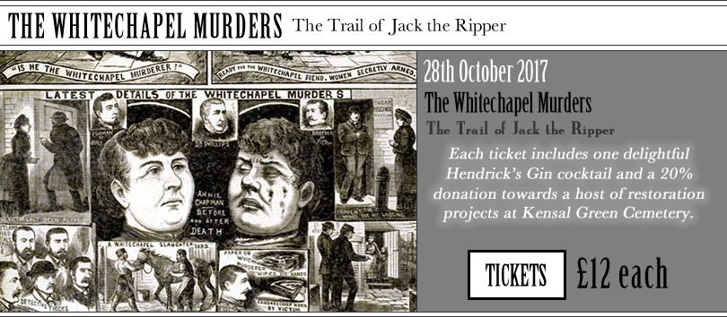 | THE WHITECHAPEL MURDERS The trail of Jack the Ripper with Peter Dean At the Dissenters Chapel on Saturday 28th October 2017 from 5:00 pm Jack the Ripper is possibly the most written about unknown individual in history. Endless works of criminology - of varying degrees of plausibility - have been written on the subject of the Whitechapel Murders and over a hundred possible suspects for the Ripper have been identified, including an English Duke, a Russian secret policeman, Queen Victoria’s obstetrician and even Lewis Carroll. Sir Arthur Conan Doyle believed that the murderer was a woman and dubbed her “Jill the Ripper”. The world’s most famous serial killer has also featured in several hundred works of fiction, ranging from Victorian penny dreadfuls to Star Trek. In his talk Peter Dean will be chucking in his twopennyworth and reassessing the grisly events of 1888 in London’s East End from a scientific and forensic viewpoint and attempting to distinguish the facts from the phantasmagoria. Travel advice to the Dissenters' Chapel - During the day guests can walk through the cemetery to get to the chapel but at night the main cemetery gates on the Harrow Road will be closed and the only accessible entrance is on Ladbroke Grove. Previously the address for this entrance was 364 Ladbroke Grove but this number has now been updated to 391.