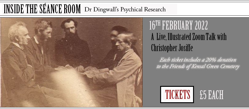 A Live, Illustrated Zoom Talk with Christopher Josiffe on Wednesday the 16th February 2022 at 7:00 pm This lecture will take place virtually, via Zoom. Attendees may request a video recording after the lecture takes place by emailing proof of purchase to info@acuriousinvitation.com In this talk, librarian Christopher Josiffe will uncover the work of the famous psychical investigator, Dr Eric Dingwall and his research into ghosts, spirits, spiritualist mediums, disembodied limbs and ectoplasm. Christopher Josiffe Christopher Josiffe is a regular contributor to Fortean Times and has also been published in Faunus, Abraxas, and The Pomegranate. He has given lectures at the Ghost Club, the Society for Psychical Research, Senate House Library and the Fortean Times Unconvention PLEASE NOTE - This talk will take place virtually via Zoom. Ticket sales will end at 5:00 pm BST on the day of the lecture. A link to the conference will be sent to the email used at checkout at 3:00 pm BST on the day of the event. Please email suzette@acuriousinvitation.com in the event your link fails to arrive. Image credit - Séance conducted by John Beattie, Bristol, England, 1872. Public domain courtesy of Wikimedia. | ![]() |