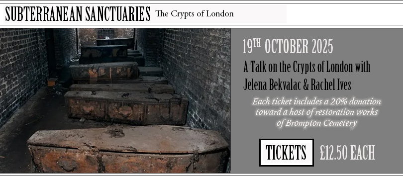 SUBTERRANEAN SANCTUARIES The Crypts of London with Jelena Bekvalac & Rachel Ives At Brompton Cemetery Chapel on Sunday 19th October at 3:30 pm Beneath the streets of London lies a hidden city of the dead: crypts, ossuaries, and vaults that have preserved the bones and stories of centuries past. In this talk, Jelena Bekvalac (Curator of Human Osteology at the Museum of London) and Rachel Ives (archaeologist and researcher) delve into the secrets of London’s crypts, drawing on their work with human remains, burial spaces and the fascinating histories entombed within. Jelena Bekvalac is the Curator of Human Osteology at the Museum of London, a role she has held since 2008 after initially joining as a research osteologist in 2003. Her work encompasses curation of extensive post-medieval and medieval skeletal collections, public outreach, research on London health and contributions to major museum exhibitions.