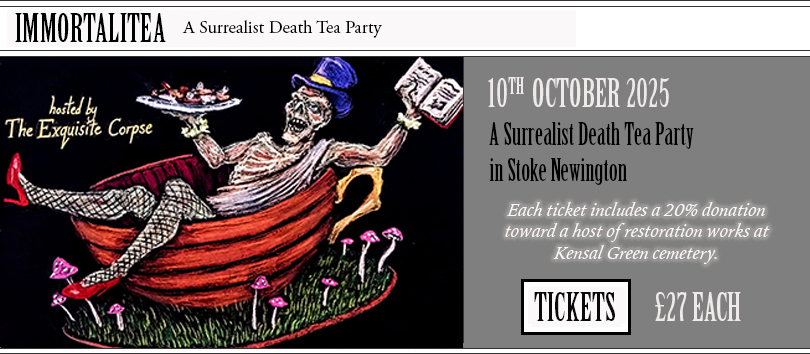 IMMORTALITEA PARTY A Surrealist Death Tea Party with Mother Wolf at The Others, 6 Manor Road N16 5SA Friday the 10th October 2025 at 7:30 pm to 1 am Hot as hash cakes off their summer tour, the creators of surreal festival smash ‘Phenomonopoly’ bring you ‘The Immortali-tea Party’. Hosted by the pun -loving ‘Exquisite Corpse’, dinner guests will join the pub-quiz style game where three teams will have to answer the undying questions of the universe using only fridge magnet poetry. Throughout the night the doorbell will ring and new guests will appear to animate their answers: Mycelium Gallagher whose song ‘Champignon Supernova’ explores how you can live forever by being buried in a mushroom suit Bob Rott whose ‘end of life portraits’ will gently take you through your own body’s nine stages of decomposition and not forgetting the housekeeper, Mememento Maureen, who does the dusting AKA sprinkles life affirming ashes on everything. A three course finger buffet of edible Dali-cacies inspired by The Surrealist Cookbook will be served: Primordial ooze bouche, devilled eyeballs, Nansense and dips, knuckle sandwiches and sweet finger surprise. The Tea genie will grant you tea wishes: Hieronymous Rooibosch, Dali-jeeling, Frida Kahmomile. NOTE: Legen-non-dairy and meat-free alternatives to finger foods will be provided. Tickets £27 Mother Wolf Founded by poet and musician John Swale, The Mother Wolf Club was created to celebrate the power of words and raw, authentic expression. In 2022 alone, the club brought shows to Secret Garden Party, the UK Festival Awards, Paris’s Le Zénith, and David Lynch’s Club Silencio—featuring artists ranging from Bombay Bicycle Club and London Grammar to Kae Tempest and Will Self. | td> |
