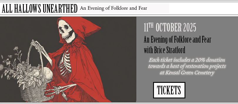 ALL HALLOWS UNEARTHED An Evening of Folklore and Fear with Brice Stratford Saturday the 11th October 2025 at 7 pm After a torchlit, parade through the cemetery, let award-winning storyteller Brice Stratford take you on a wild and witchy ride, fascinating and unnerving in equal measure, through the twists and turns of Allhallowstide, and the forgotten history of Halloween and the wider Hallowmas season. With ghost stories, ancestor worship, bone fires, otherworld pixies, Pagan belief and archaic, Christian mythology along the way, Stratford shares for the first time the deeper tales and stranger lore that lurk beneath the tricks and treats we know so well, and the ancient flame that keeps the Jack O’Lantern lit. Light the candles, lock the doors, and prepare to be unsettled. Are you sitting comfortably? Then let’s begin. Tickets £15 including a 20% donation toward a host of restoration projects at Kensal Green Cemetery and a Victorian punch. Brice Stratford Brice Stratford is a storyteller, theatre director, folklorist, historian, and former stuntman. Born and raised in the New Forest, he is the founder of the award-winning theatre company The Owle Schreame, and a regular at folk, heritage and Halloween festivals across the UK. In 2024 he launched the Finding Folklore podcast—an ongoing exploration of the strange, hidden stories beneath England’s surface—and this talk marks the release of his third book, Halloween Folklore and Ghost Stories. He also serves on the board of the New Forest National Park Authority and contributes regularly to cultural and arts publications. | ![]() |