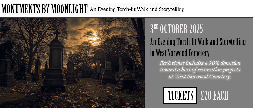MONUMENTS BY MOONLIGHT An Evening Torch-lit Walk and Storytelling in West Norwood Cemetery with Robert Stephenson and Giles Abbott on Friday 3rd October 2025 at 7:00 pm Once revered as a sanctuary for the departed and the living alike, West Norwood emerged from the depths of Victorian London in 1837. With an air of aristocratic reverence, it swiftly earned its place among the illustrious Magnificent Seven cemeteries, becoming a haven where souls sought solace beneath the watchful gaze of towering monuments. The cemetery is the last resting place of, among others, Mrs Beeton, author of the seminal manual on household management, Paul Julius Reuter, founder of the eponymous news agency, Henry Tate, the art gallery patron, and Thomas Letts, who popularised the diary. Join Robert Stephenson for a torch-lit evening walk through the cemetery's most cherished and surprising monuments, which will lead you to the newly-restored St Stephen’s chapel, where you can chill by candle-light to eerie stories of the supernatural told by Giles Abbott. Tickets £20 including a 20% donation toward a host of restoration projects at West Norwood Cemetery Robert Stephenson Robert Stephenson is a qualified City of London Culture and Heritage guide and a trustee at Kensal Green and Brompton cemeteries. He teaches on London and death studies. Robert is also chairman of the National Federation of Cemetery Friends. Giles Abbott Giles Abbott began storytelling in 1999 after sudden sight loss and is now the UK’s only professional blind storyteller. An award-winning performer, he tells myths and folktales from British, Norse, Greek, and global traditions, and uses storytelling to inspire confidence and literacy in both children and adults. |