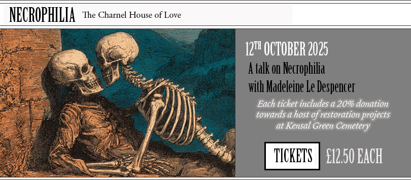 In this lecture Madeleine LeDespencer will discuss Necrophilia in art, literature, and the criminal record. We will explore notable case studies of necrophilia throughout history and how modern forensic criminologists classify the various manifestations of this behaviour to better understand what drives the living to see intimacy with the dead. From the tender sentimentality of Mary Shelley keeping her husband’s heart in a tin box to the brutal necrosadism of François Bertrand, the full spectrum of necrophilia will be uncovered and exposed.