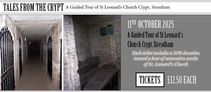 TALES FROM THE CRYPT A Guided Tour of St Leonard’s Church Crypt, Streatham On Saturday 11th October at 10 am Discover one of Streatham’s hidden historical landmarks with a guided tour of the crypt beneath St Leonard’s Church. Parts of the church date back to the 14th century, and its atmospheric crypt tells the story of Streatham’s past through the families, parishioners, and everyday Londoners laid to rest beneath its stone floor. Among them are the Thrales, once close friends of Dr Johnson, and the remains of local residents reinterred during 19th-century churchyard clearances. Though the church suffered a devastating fire in 1975, the crypt survived—its vaults and charnel spaces remarkably intact. John W Brown is the longstanding Parish Archivist for St Leonard’s Church, Streatham and also serves as Archivist for the Streatham Society. With a deep-rooted passion for local history, he has authored several guides and given numerous talks on topics ranging from Streatham’s medieval roots to its transformation through the centuries. He is often referred to affectionately as “Mr Streatham”.